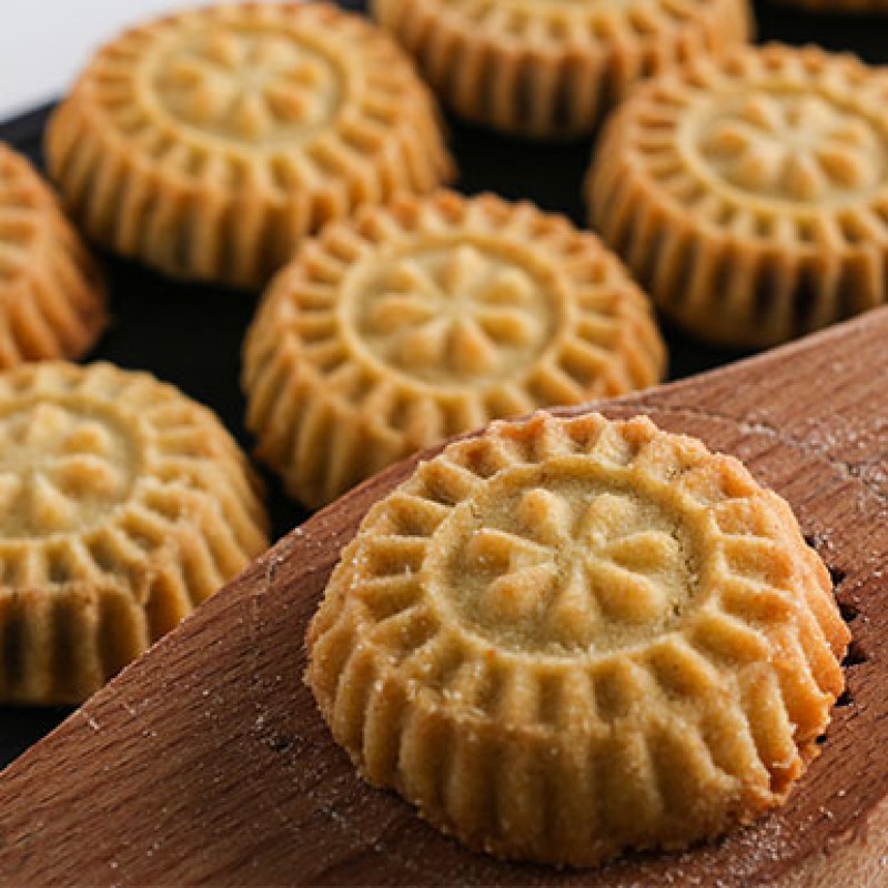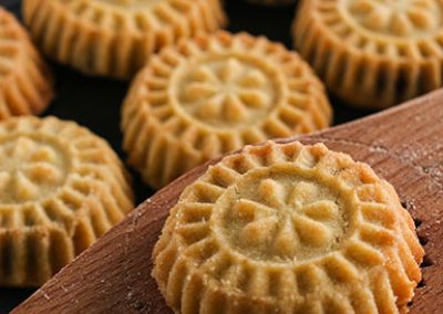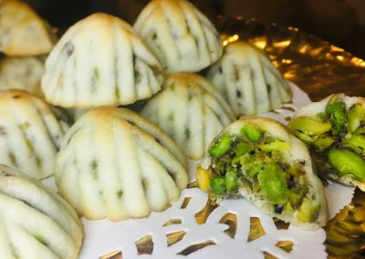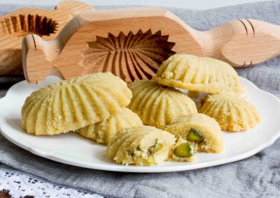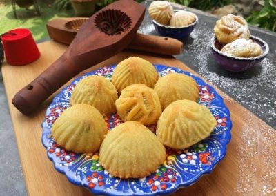 Des sablés à base de semoule et de ghee, de sucre, de beurre, d’eau de rose et de fleur d’oranger. Avant la cuisson, la pâte est soit farcie de pistaches arrosées d’eau de rose, de noix mélangées à du sucre et de la cannelle, soit de dattes réduites en pâte avec un peu d’huile ou de beurre. Ils sont aussi traditionnellement remplis de noix, de figues ou de pistaches et souvent recouverts de sucre. Le Maamoul est généralement fabriqué à partir d’une pâte de semoule et est aromatisé au « mahlab » (graines de cerises écrasées, que l’on trouve à l’intérieur des noyaux) et au mastic (gomme arabique – résine de l’acacia). Les formes (aplaties ou bombées) du Maamoul sont souvent réalisées à l’aide d’un moule ad hoc en bois appelé « qalab ». Ils peuvent être aussi formés à la main à l’aide d’une pince à pointes « malqat ».