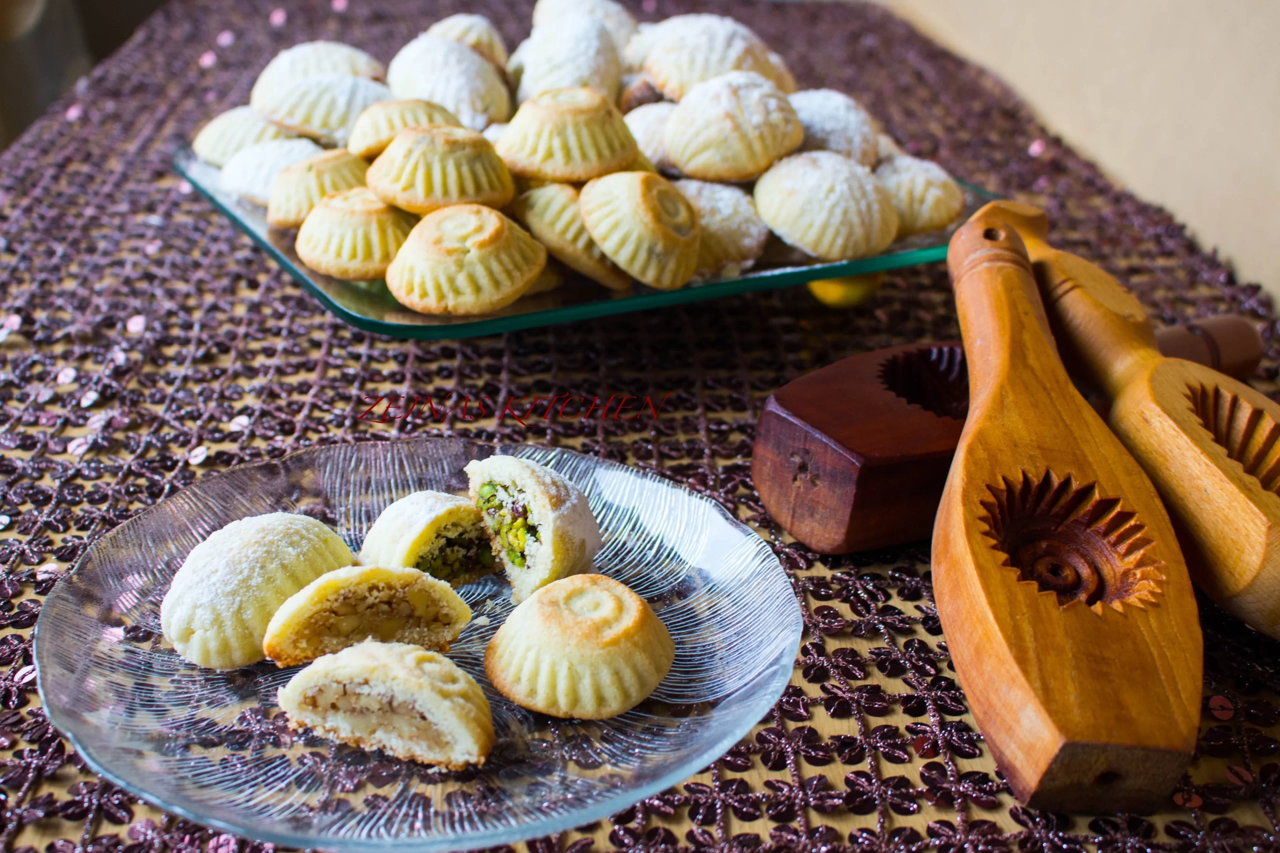 Dans un article de Hala KODMANI publié en avril 2020 dans le Journal « Libération », nous pouvons un peu goûter à cette ambiance de fête et de fébrilité : « Il faut tout d’abord descendre au souk des épiciers pour choisir les kilos de cerneaux de noix, de pistaches décoquées et de pâte de dattes de bonne qualité. Sans oublier l’eau de fleur d’oranger pour parfumer. Le lendemain, pendant qu’on se met à concasser les fruits secs, les enfants rôdent autour pour en subtiliser discrètement une petite poignée. Trois immenses saladiers se remplissent en fin de journée de trois farces distinctes : noix et pistaches sont sucrées et arrosées d’eau de fleur d’oranger tandis que la purée de dattes est mélangée à du beurre. Puis dans un quatrième récipient plus grand encore, on prépare la pâte avec de la semoule et du beurre. Tout cela repose toute une nuit sur la grande table de la cuisine.