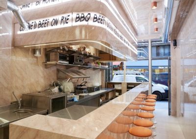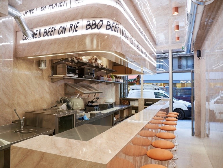 Nous nous donnons rendez-vous au 21, rue Rambuteau (Quartier du Marais ; non loin du Centre Pompidou – Beaubourg), et nous entrons chez « Janet by Homer ». On reconnaît tout de suite où l’on est grâce à l’enseigne rose ! Dans un Quartier gay ; c’est un clin d’œil ; non ? Ce n’est pas vraiment un restaurant. C’est un lieu de passage et d’expérience. On vient y goûter le corned beef (sandwich au pastrami). Vous avez dit « Pastrami » !?! Cette spécialité juive est de la viande de bœuf préparée dans une saumure d’épices, bouillie puis fumée dans les règles de l’art. Elle remplace avantageusement le jambon de porc, et même la viande de bœuf que nous avons l’habitude de consommer. La viande est servie chaude ou tiède, présentée avec un pain brioché de seigle, du cumin…, de la moutarde. On n’entre pas seulement chez « Janet by Homer » pour emporter mais pour vivre une vraie expérience au comptoir. L’accueil y est chaleureux. Le restaurant n’affiche pas le Diplôme Cacher (la Teoudat) attestant que tout est en règle, et en parfaite adéquation avec la cacheroute juive… ; mais on nous l’affirme la nourriture et la viande sont Cacher ! Ce qui nous est proposé change radicalement avec les traditionnels Falafels, les Chawarma, et la cuisine juive traditionnelle… Il y a du goût, des saveurs, du plaisir au bout des doigts pour déguster cet « énorme » sandwich. On y dégustera aussi le « Doggy » (hot dog) ou selon vos envies un sandwich à la choucroute !!!