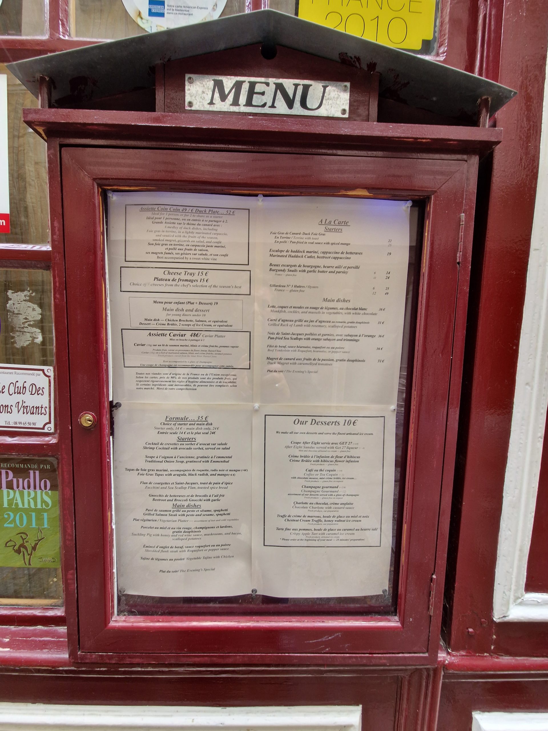 Spaghetti d’Escargots à la crème d’ail au persil, Gambas poêlées aux piments et ses légumes de saison, Terrine de foie gras de canard maison, Noix de filet d’agneau au jus de romarin, pommes Grenaille, Filet de bœuf, sauce béarnaise ou au poivre, Duo de sorbets de citron et de cactus à la téquila, Crème brûlée au Carambar, tarte fine aux pommes et glace caramel au beurre salé.